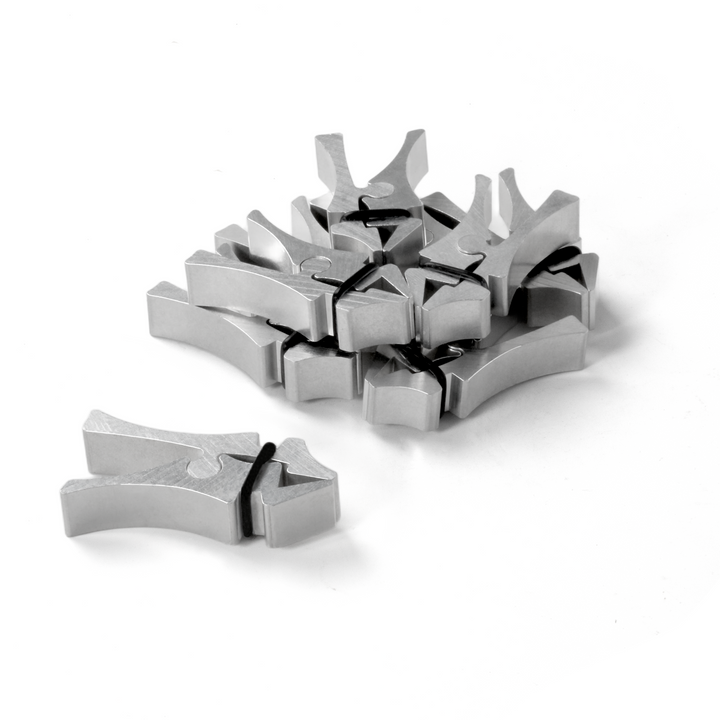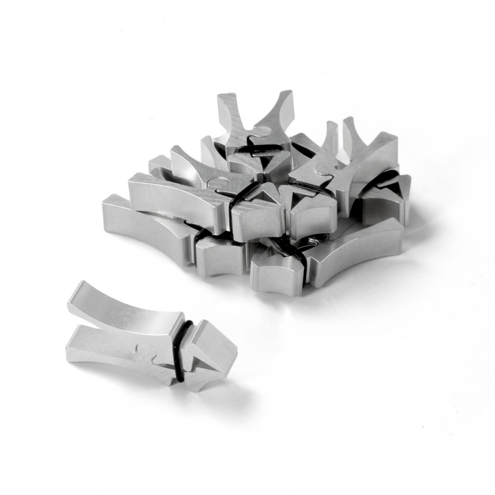 The Kerfed Lining Clamps are custom-made for installing linings with precision. These lightweight aluminum clamps, originally designed by Taylor Guitars, are ideal for gluing traditional linings. They eliminate gaps, fit nearly all guitar shapes, and are easy to install quickly. The clamps feature adjustable tension through O-rings, ensuring no-dent design and customizable pressure. The pack includes 10 clamps and 20 O-rings, with a recommendation of 30-40 clamps per side for a dreadnought or OM guitar.